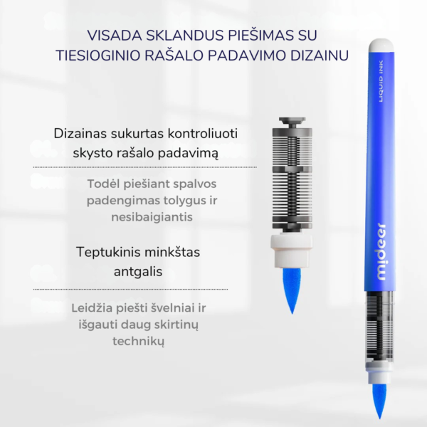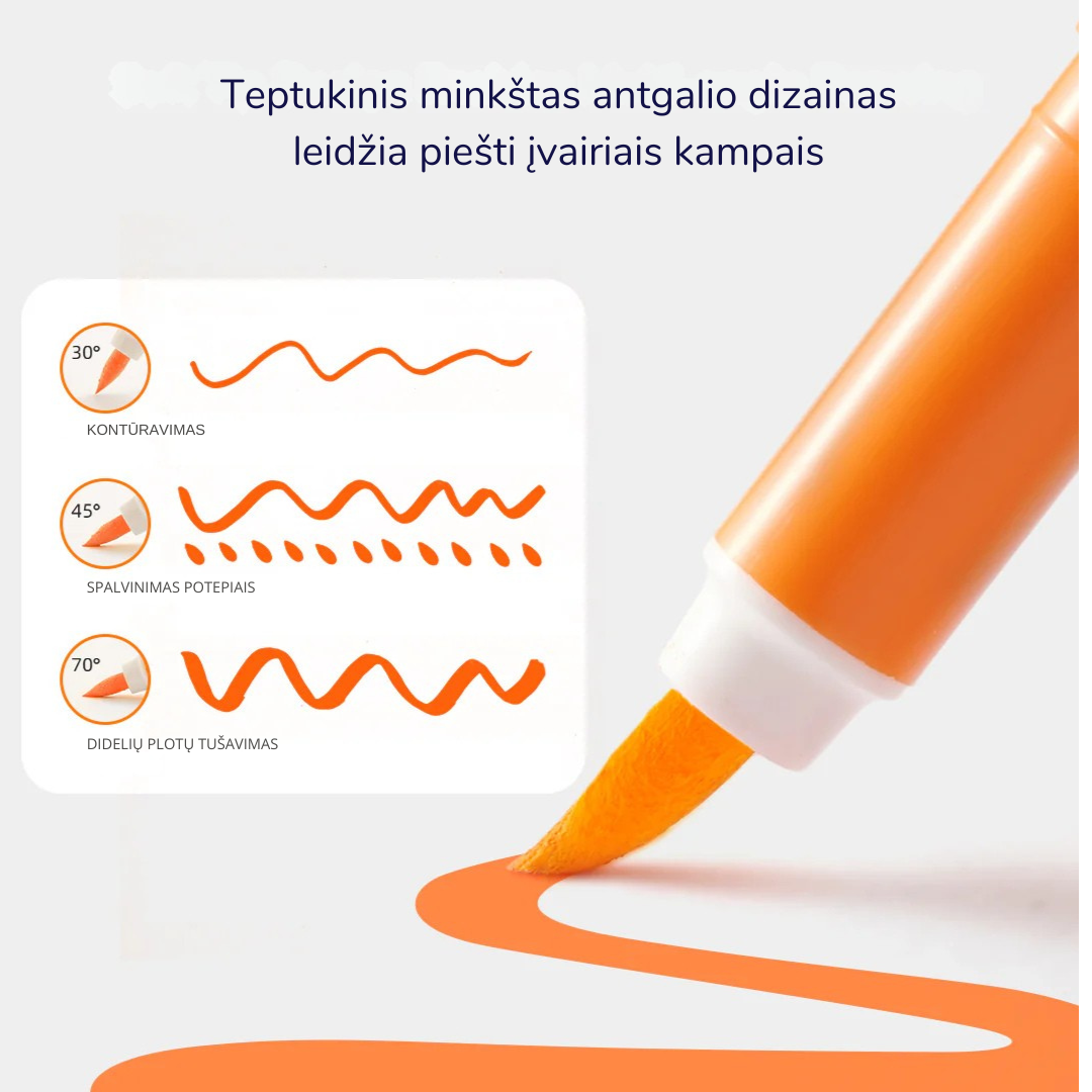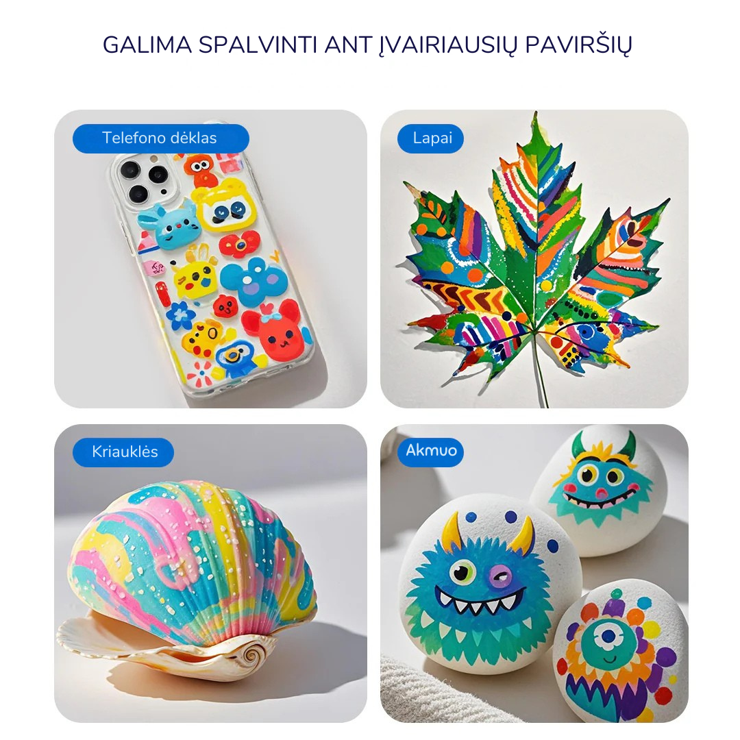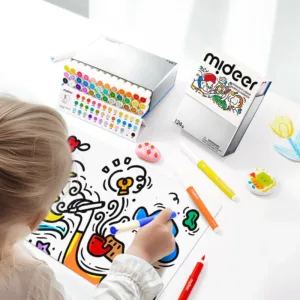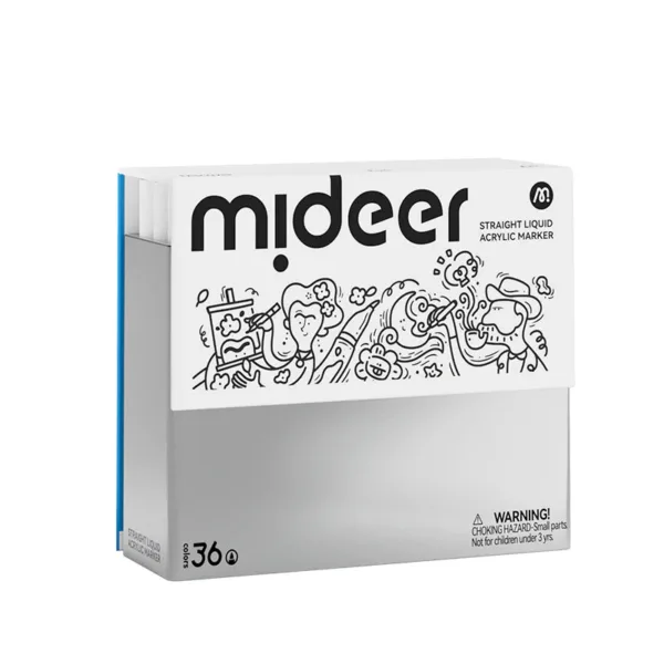 mideer akriliniai markeriai su skysto rašalo užpildu, aprūpinti išmania rašalo kontrolės sistema, užtikrinančia tolygų padengimą ir neleidžiančia rašalui pratekėti. 0,5–5 mm nailono minkštas šepetėlio galiukas, užtikrinantis sklandų ir tolygų piešimą. Šis rinkinys leidžia kurti meninius darbus ant įvairių paviršių, tokių kaip petroglifai, keramika, stiklas, medis, audinys, akmuo, metalas, plastikas, kalėdinės dekoracijos, Helovino piešiniai, gimtadienio dovanos ar bet kokie „pasidaryk pats“ projektai. Visos spalvos yra ryškios ir sodrios. Taip pat gali būti naudojami daugiasluoksniam spalvų derinimui. Spalvos neblunka ir nepersisunkia per popierių.