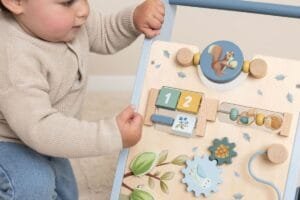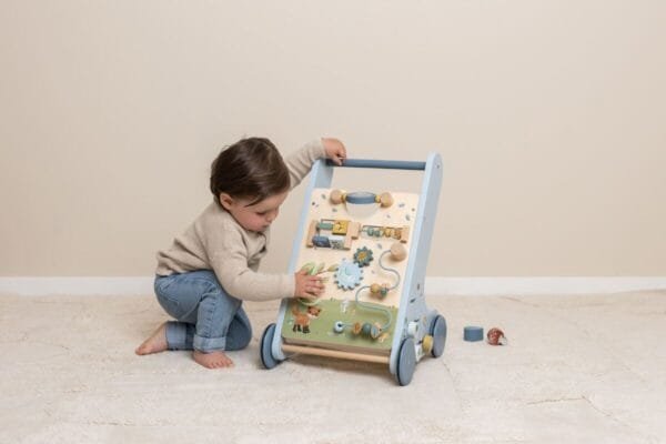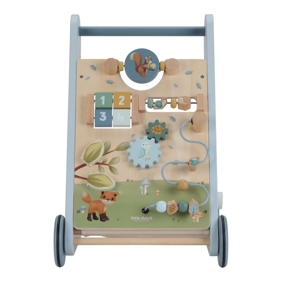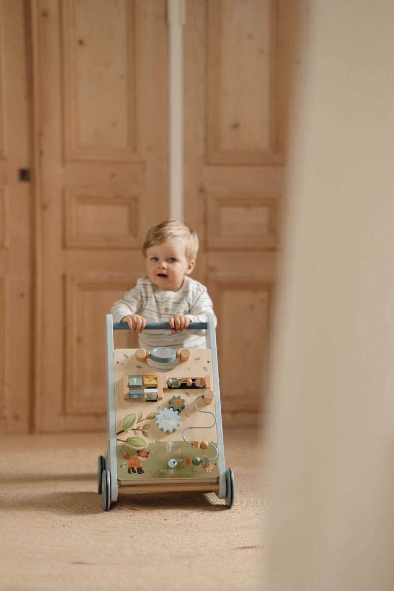 Vaikščiokite, žaiskite ir mokykitės! Jums bus labai smagu tyrinėti visą šio „Forest Friends“ stumduko veiklą. Pasukite pavaras, kad pelėda ir gilė apsisuktų! Padovanok veidrodį! Ir išmok skaičiuoti su sraige ir ežiuku. Šis medinis stumdukas siūlo įvairias sudėtingas veiklas, kurios padeda lavinti jūsų vaiko motorinius įgūdžius. Meskite iššūkį savo mažyliui su daugybe užsiėmimų ant šios gražiai dekoruotos vaikštynės. Yra 8 veiklos, kurias reikia atrasti ir išmokti. Dėl savo tvirtos konstrukcijos vaikštynė tinka 12 mėnesių ir vyresniems vaikams, kurie yra pasiruošę pirmiesiems žingsniams. Pasiruoškite entuziastingam padrąsinimui, kai jūsų mažylis su šia vaikštynė naršo po namus. Guminiai ratai nepaliks jokių žymių ant grindų ir yra saugūs naudoti viduje.