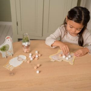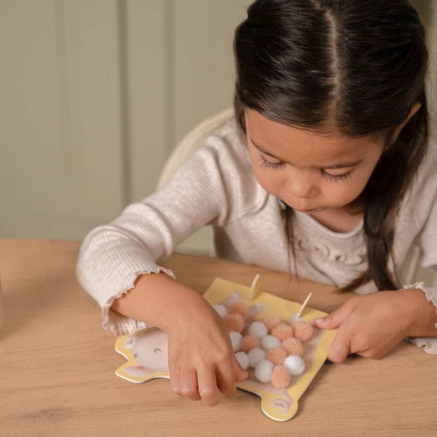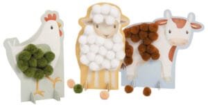 Smagus amatas jauniesiems menininkams! Priklijuokite tinkamos spalvos pomponą ant avies, vištienos, karvės ir kiaulės ir kurkite gražiausius paveikslus! Kūrybingi žaislai, skirti lavinti smulkiąją motoriką ir susikaupti amatų popietės metu.