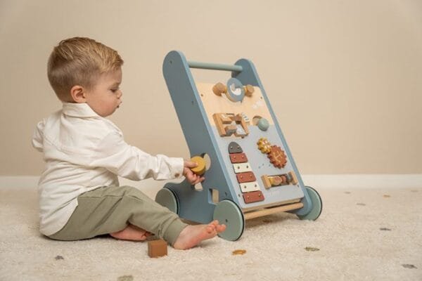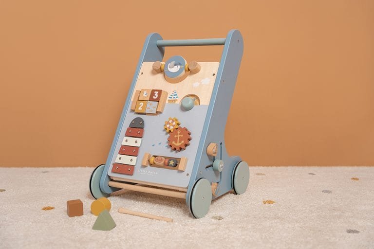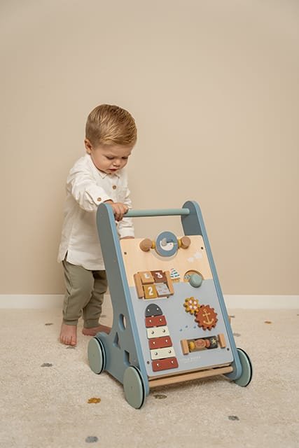 Ženk pirmus žingsnelius, žaisk ir mokykis! Šis dailus olandų gamintojo medinis stumdukas padės mažyliui ne tik drąsiai žengti pirmuosius žingsnius, bet ir pasiūlys daugybė veiklų. Besisukančios ir judančios edukacinės medinės detalės ilgam užims jūsų mažylius. Skatins tyrinėti, pažinti, lavins rankų-akių koordinaciją, smulkiąją motoriką. Dėl stabilaus dizaino tinkamas pradėti mokytis eiti. Guminiai ratai, todėl saugu naudoti patalpų viduje. Stumdukas- viena populiariausių dovanų 1-ojo gimtadienio proga.