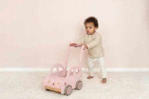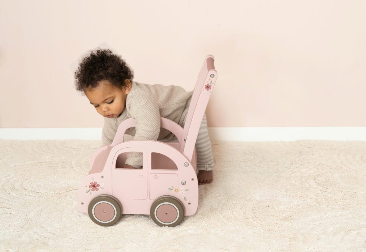 Leiskitės į nuotykius per svetainę su šiuo rožiniu stumdomu vežimėliu. Žingsnis po žingsnio išmoksite vaikščioti, o šis stumiamas vežimėlis jums padės. Medinis rožinis stumdomas vežimėlis yra ne tik patogus norint padėti jūsų mažyliui žengti pirmuosius žingsnius, bet ir jo dizainas puikiai tinka jūsų kūdikiui. Jūsų mažylis gali užpildyti jį žaislais, kad galėtų žaisdami viduje, arba pasiimti su savimi į žygius pėsčiomis! Puikiai tinka lavinti pusiausvyrą, koordinaciją ir motorinius įgūdžius. O dėl guminių juostelių aplink ratus jums nereikės jaudintis dėl grindų, kai jūsų mažylis keliauja po kambarį.